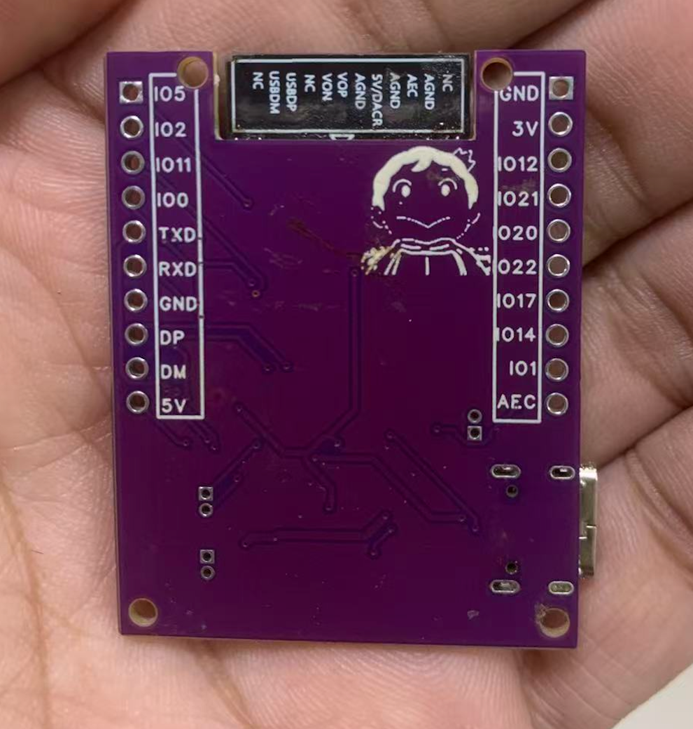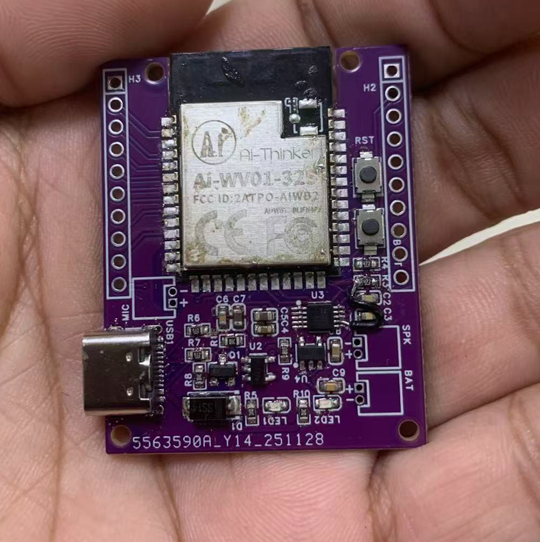 这个立创紫感觉还挺好看的。板子后来又做了一些修改,MIC - 开始标签名称写的MIC-,然后AGND叫 AGND 导致 麦克风 负极和AGND没有连接。然后说话听不到。后来发现,飞了根线。现在PCB已经修复。CH340E 供电 连的VCC 导致 串口 TXD 与RXD 电压5V 不满足 模组。后来经过群友提醒, 供电改为 3.3V 串口 电压 变成3.3V 这里需要注意。另外,CH340E 的 TXD 与 RXD 要 交叉连接 模组的 TXD 与 RXD 。